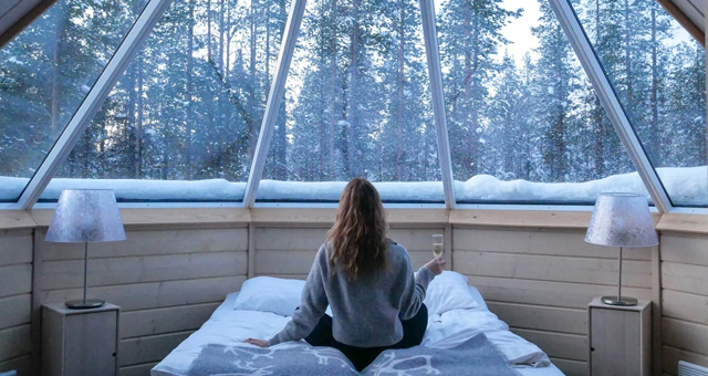 Northern Lights Village se encuentra a 17 km de Levi y ofrece una forma mágica de contemplar el cielo estrellado invernal. Con un techo de cristal con calefacción láser situado justo encima de la cama king size, disfrutarás de una vista perfecta del cielo nocturno y la oportunidad de avistar la aurora boreal.